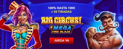 Solo para primeros depósitos. Máx. Bono 100€. 50 Tiradas Gratis en la slot Mega Fire Blaze Big Circus. Las Tiradas Gratis tienen un valor de 0,10€. Requisitos de apuesta: 30 veces el depósito + el Bono recibido y 60 veces las ganancias de los Giros Gratis (solo en las slots) antes de 30 días. La apuesta máxima es el 10% (mín. 0.10€) de las ganancias en giros gratis y el Bono recibido, o 5€ (aplica el monto mínimo). Los giros deben ser jugados y/o el Bono debe ser solicitado antes de utilizar los fondos depositados. Se aplica la política de bonificaciones.